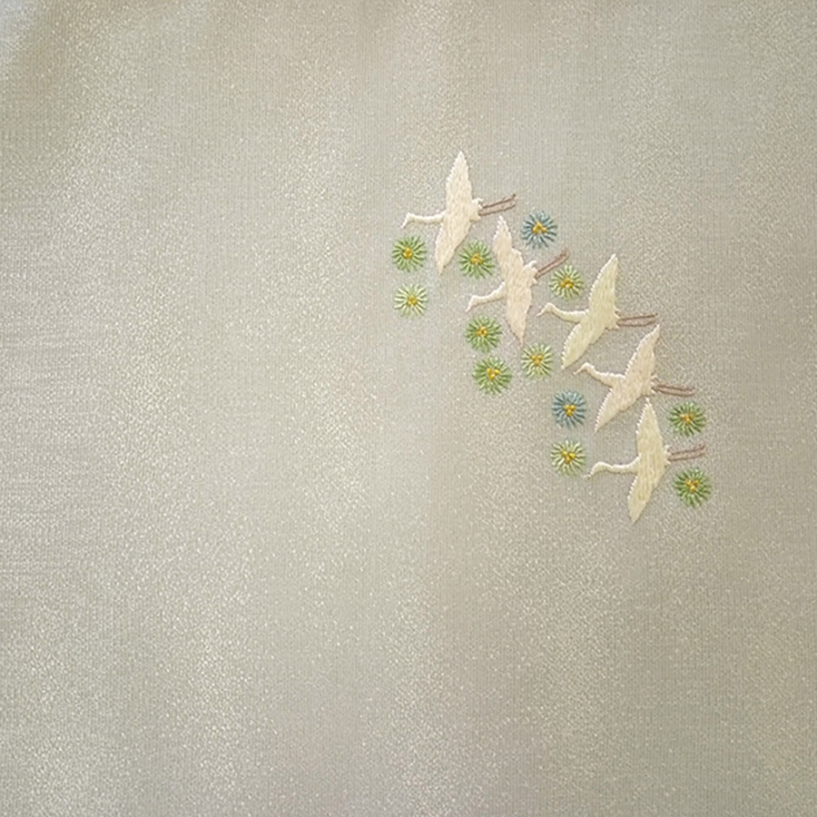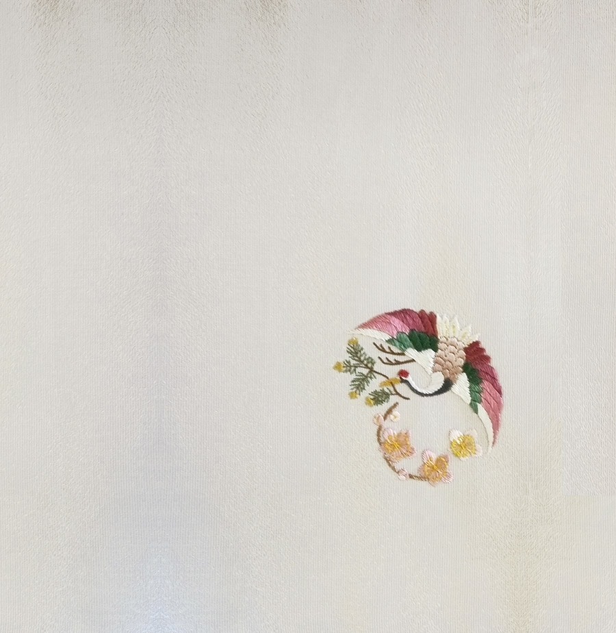 金糸が少し織り込まれた帯地に、向い鶴の文様を刺繍しました。そのあとに、金封袱紗として仕立てます。